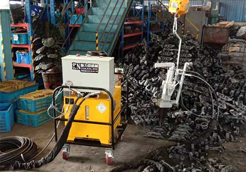 鑄件澆冒口(kou)分離器(qi)工作原(yuan)理:工藝流程是(shi):油(you)泵站(zhan)接380伏電(dian)源,油泵(beng)站和分離器通(tong)過2根高壓油管(一進一出)連接,分離器由(you)平衡葫蘆吊懸掛方便操(cao)作。以下是工作原理。鑄件澆冒(mao)口分離器通過液壓泵站(zhan)產生18-70MPa液(ye)壓(ya)動(dong)力。開機時,按下(xia)鑄件分(fen)離器手把開關(guan),油泵站由低壓(ya)泵送油,當壓(ya)力達到(dao)18MPa,高低(di)壓(ya)切換閥切斷低(di)壓(ya)泵,這時(shi),由高壓(ya)柱塞泵工作送油,高壓(ya)柱塞泵產生大70Mpa工作(zuo)壓(ya)(ya)(ya)力(li)(高低(di)壓(ya)(ya)(ya)切(qie)換原理就是低(di)壓(ya)(ya)(ya)泵快速送大(da)量(liang)的(de)油(you)(you),而高壓(ya)(ya)(ya)柱(zhu)塞泵是少量(liang)油(you)(you)產生(sheng)高壓(ya)(ya)(ya),大(da)程度防(fang)止大(da)量(liang)油(you)(you)進出,防(fang)止油(you)(you)泵站升溫),油(you)(you)管內高壓(ya)(ya)(ya)油(you)(you)推動(dong)分離器油(you)(you)缸內活塞,活塞推動(dong)前端(duan)尖鐵(tie),尖鐵(tie)向兩邊(bian)推動(dong)楔鐵(tie),以上油(you)(you)壓(ya)(ya)(ya)一系列(lie)動(dong)作(zuo)產生(sheng)大(da)噸分離張力(li),將鑄件澆冒口分離器從(cong)母(mu)體(ti)分離下來。